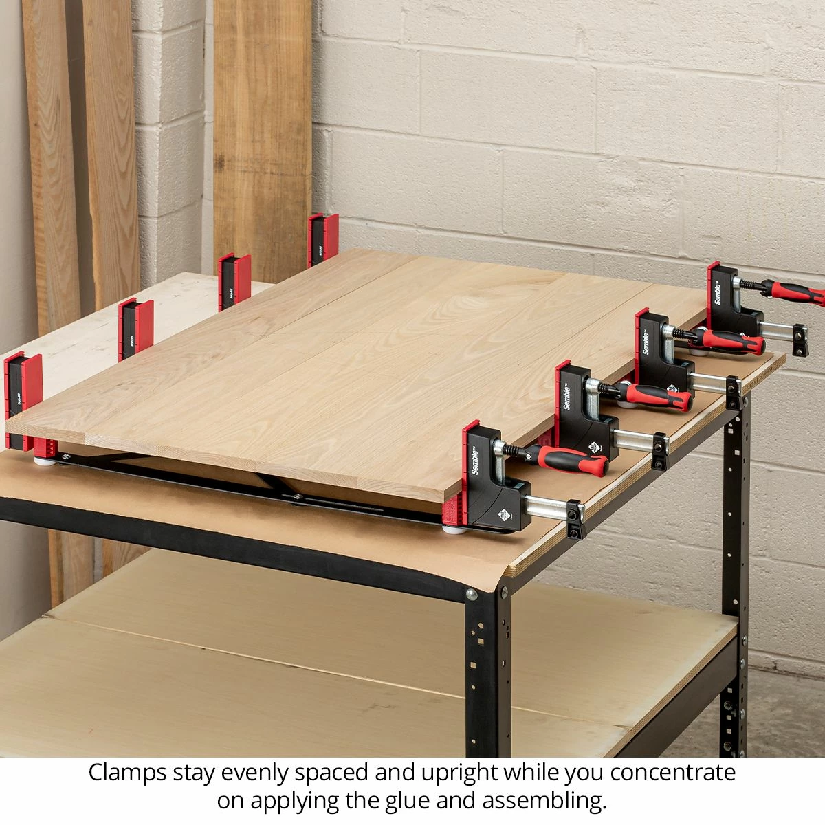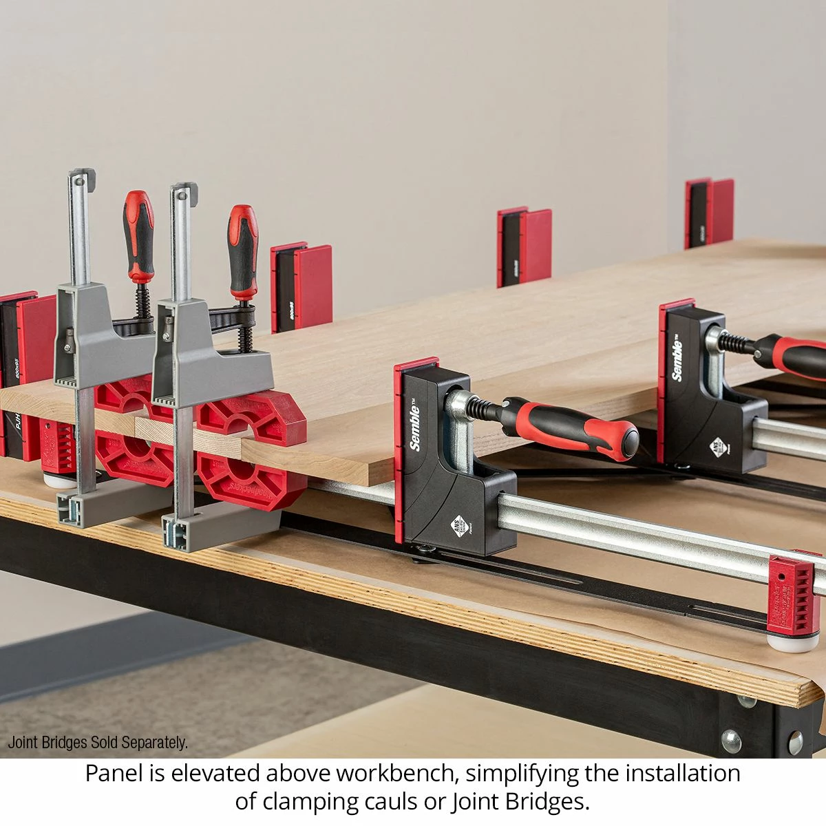 Working with your clamps held in an Xpander system makes everything about your glue-up go smoother. The clamps are locked vertically, so they won’t fall over if you bump them. The clamping heads adjust easily along the rail, since the bar is held in place. As mentioned before, spacing between the clamps is automatic. And, the clamps are elevated off the work surface, simplifying the application of clamping cauls or Woodpeckers Joint Bridges.