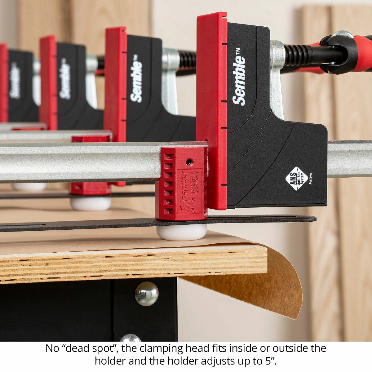 The linkage bars of the Xpander are powder-coated steel…glue pops off easily. The clamp holders are tough injection-molded polycarbonate. Each clamp holder ends in a nylon foot that slides easily and won’t mar the surface of your workbench. Set screws in the clamp holders quickly and easily secure your clamps in the Xpander. Once installed, you can leave them in all the time, or pop them out if needed individually.